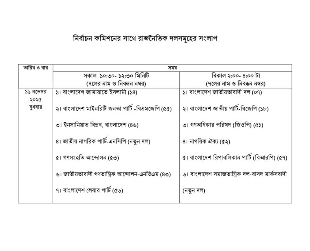 সকাল সাড়ে ১০টা থেকে সাড়ে ১২টা পর্যন্ত বাংলাদেশ জামায়াতে ইসলামী, বাংলাদেশ মাইনরিটি জনতা পার্টি-বিএমজেপি, ইনসানিয়াত বিপ্লব বাংলাদেশ, জাতীয় নাগরিক পার্টি-এনসিপি, গণসংহতি আন্দোলন, জাতীয়তাবাদী গণতান্ত্রিক আন্দোলন-এনডিএম, বাংলাদেশ লেবার পার্টির সঙ্গে সংলাপ হবে।