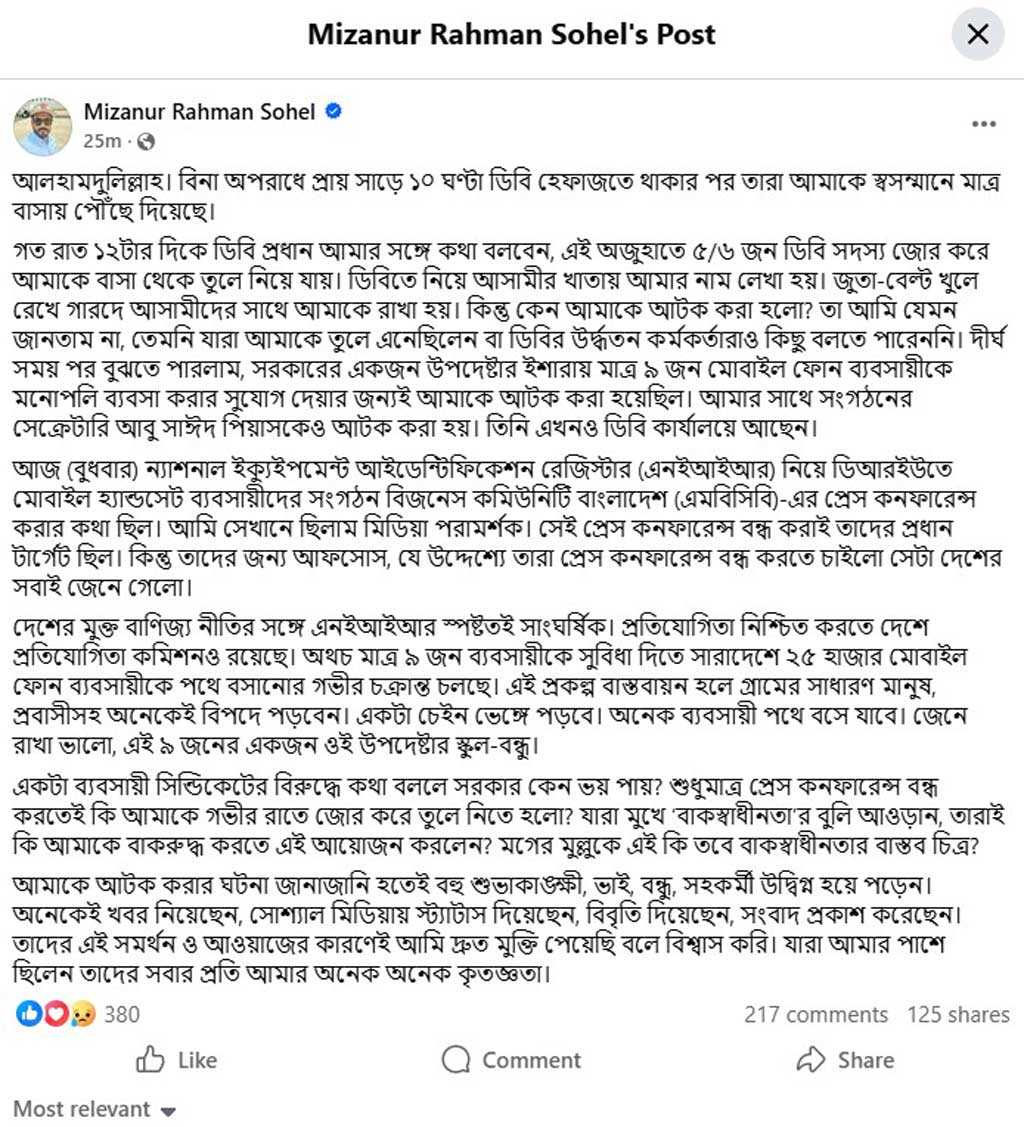 সেখানে তিনি অভিযোগ করেছেন, মোবাইল হ্যান্ডসেট ব্যবসায়ীদের সংগঠন বিজনেস কমিউনিটি বাংলাদেশের (এমবিসিবি) সংবাদ সম্মেলন পণ্ড করার জন্য ‘সরকারের একজন উপদেষ্টার ইশারায়’ তাকে আটক করা হয়েছিল, কারণ তিনি ওই সংগঠনের মিডিয়া পরামর্শক হিসেবে যুক্ত রয়েছেন।