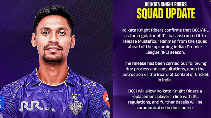 তথ্য মন্ত্রণালয়ের সহকারী সচিব মোঃ ফিরোজ খান স্বাক্ষরিত বিজ্ঞপ্তিতে বলা হয়েছে, “ভারতীয় ক্রিকেট বোর্ড কর্তৃক আগামী ২৬ মার্চ ২০২৬ থেকে অনুষ্ঠেয় ইন্ডিয়ান প্রিমিয়ার লিগ (আইপিএল) ক্রিকেট খেলায় বাংলাদেশের তারকা খেলোয়াড় জনাব মুস্তাফিজুর রহমানকে কলকাতা নাইট রাইডার্স দল থেকে বাদ দেওয়ার নির্দেশ দৃষ্টিগোচর হয়েছে। ভারতীয় ক্রিকেট বোর্ডের এহেন সিদ্ধান্তের কোনো যৌক্তিক কারণ জানা নেই এবং এমন সিদ্ধান্ত বাংলাদেশের জনগনকে ব্যথিত, মর্মাহত ও ক্ষুব্ধ করেছে।”