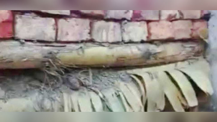মাদারীপুরের শিবচরে রাস্তার পাশে গাইড ওয়াল নির্মাণে ইটের গাঁথুনির নিচে দেওয়া হয়েছে কলা গাছ।