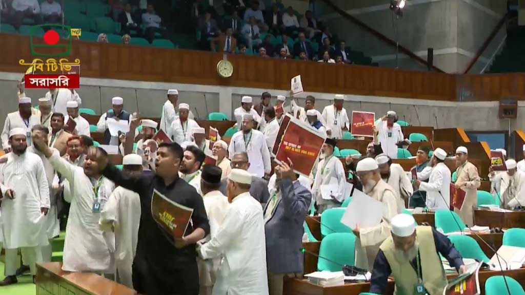 বৃহস্পতিবার বিকাল সাড়ে ৩টার দিকে যখন ভাষণ দেওয়ার জন্য রাষ্ট্রপতি মো. সাহাবুদ্দিনের সংসদের অধিবেশন কক্ষে প্রবেশের ঘোষণা দেওয়া হল, বিরোধী দলের আসনে থাকা জামায়াত জোটের এমপিরা আসন ছেড়ে দাঁড়িয়ে প্রতিবাদ জানাতে শুরু করেন। এ সময় তারা ‘জুলাইয়ের সাথে গাদ্দারি চলবে না’ লেখা লাল রঙের প্ল্যাকার্ড প্রদর্শন করেন।