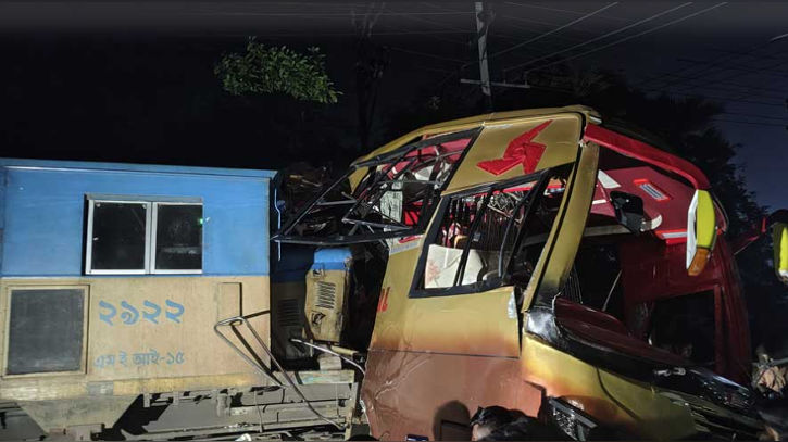 সংঘর্ষের পর দুমড়ে-মুচড়ে যাওয়া বাসটিকে ছেঁচড়ে প্রায় এক কিলোমিটার দূরে নিয়ে যায় ট্রেন।