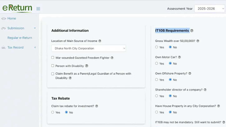 বিদেশে অবস্থানরত বাংলাদেশির ক্ষেত্রে অনলাইনে রিটার্ন দাখিলের বাধ্যবাধকতা না থাকলেও তার পাসপোর্ট নম্বর, জাতীয় পরিচয়পত্র নম্বর, ই-মেইল অ্যাড্রেস ইত্যাদি তথ্য দিয়ে বিদেশে বসেই ই-রিটার্ন দাখিলের সুযোগ রয়েছে।