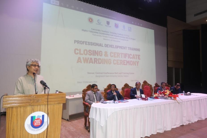 সমাপনী অনুষ্ঠানে প্রশিক্ষণার্থীদের মধ্যে সনদ বিতরণ করেন প্রফেসর ড. মোহাম্মদ তানজীমউদ্দিন খান। অনুষ্ঠানে হিট প্রকল্পের পরিচালক প্রফেসর ড. আসাদুজ্জামান, কোর্স পরিচালক প্রফেসর ড. সিরাজুল ইসলাম এবং প্রফেসর ড. জহির রায়হান বক্তব্য দেন। এসময় ইউজিসি, বাউবি ও হিট প্রকল্পের ঊর্ধ্বতন কর্মকর্তারা উপস্থিত ছিলেন।