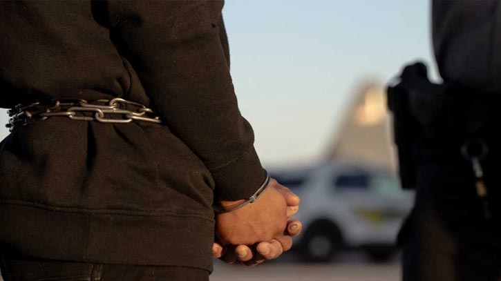 সামরিক উড়োজাহাজে তোলার আগে এক অবৈধ অভিবাসী।