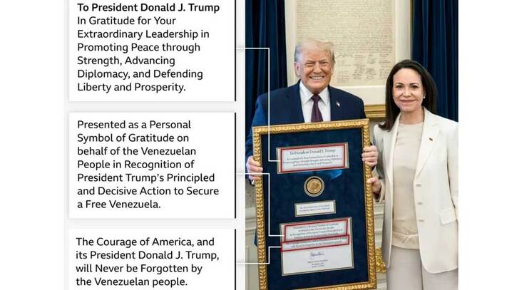 বৃহস্পতিবারই তিনি মার্কিন প্রেসিডেন্ট ডনাল্ড ট্রাম্পের সঙ্গে সাক্ষাৎ করে নিজের পাওয়া নোবেল শান্তি পুরস্কারের পদক তাকে উপহার দিয়েছিলেন। ভেনেজুয়েলার ‘স্বাধীনতার’ প্রতি ট্রাম্পের অঙ্গীকারের স্বীকৃতিস্বরূপ এ উপহার দেওয়া হয়েছে বলেও মাচাদো সেসময় জানিয়েছিলেন।