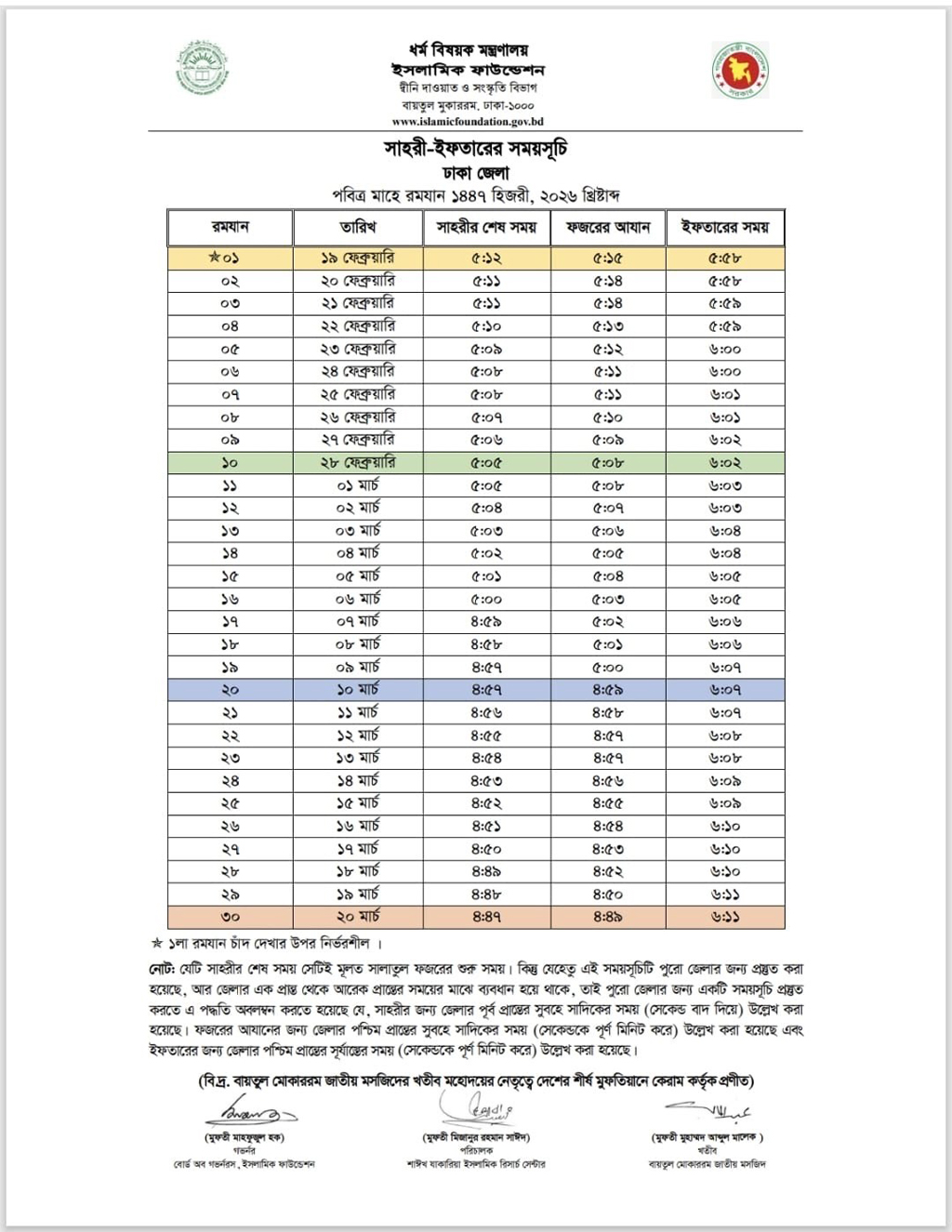 বিজ্ঞপ্তিতে বলা হয়েছে, প্রত্যেক জেলার জন্য ইসলামিক ফাউন্ডেশন যে সময়সূচি নির্ধারণ করেছে, তা অনুসরণ করবেন ওই এলাকার রোজাদাররা।