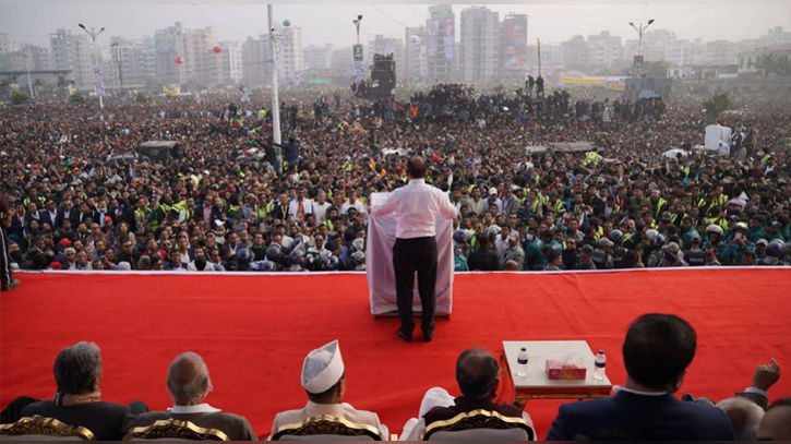 “আসুন, আমরা আল্লাহ রাব্বুল আলামিনের দরবারে হাত তুলে প্রার্থনা করি—হে রাব্বুল আলামিন, হে একমাত্র মালিক, হে একমাত্র পরওয়ার দিগার, হে একমাত্র রহমত দানকারী, হে একমাত্র সাহায্যকারী; আজ আপনি যদি আমাদের রহমত দেন, আমরা এই মানুষ কঠোর পরিশ্রমের মাধ্যমে আমাদের প্রত্যাশিত বাংলাদেশকে গড়ে তুলতে পারবো। আজ যদি আল্লাহর রহমত এই দেশ এবং এই দেশের মানুষের পক্ষে থাকে, আল্লাহর সাহায্য আল্লাহর দয়া যদি এই দেশের মানুষের ওপরে এই দেশের ওপরে থাকে. আমরা আমাদের প্রত্যাশিত বাংলাদেশ গড়ে তুলতে সক্ষম হবো।”