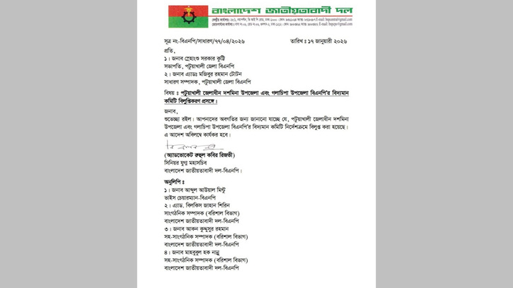 শনিবার বিএনপির জ্যেষ্ঠ যুগ্ম-মহাসচিব রুহুল কবির রিজভীর সই করা বিবৃতিতে এ আদেশ দেন হয় বলে জানান পটুয়াখালী জেলা বিএনপির সাধারণ সম্পাদক মজিবুর রহমান টোটন।